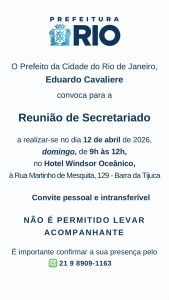 Reunião de Secretariado. Data 12 abr 2026 Evento passado Hora 09:00 - 12:00 Local: Hotel Windsor Oceânico. Rua: Martinho de Mesquita,129 Barra Da tijuca. Participantes: Angelina Gabrielle Moreira Ornelas Pereira.